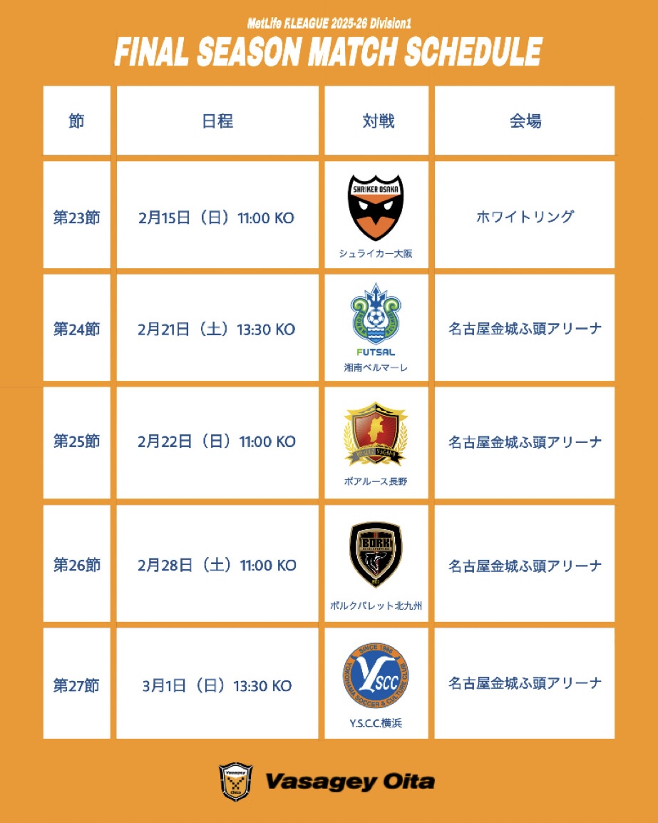 Fリーグより「メットライフ生命Fリーグ2025-26ディビジョン1 ファイナルシーズン」の対戦カードについて、下記の通り決定したことをお知らせいたします。